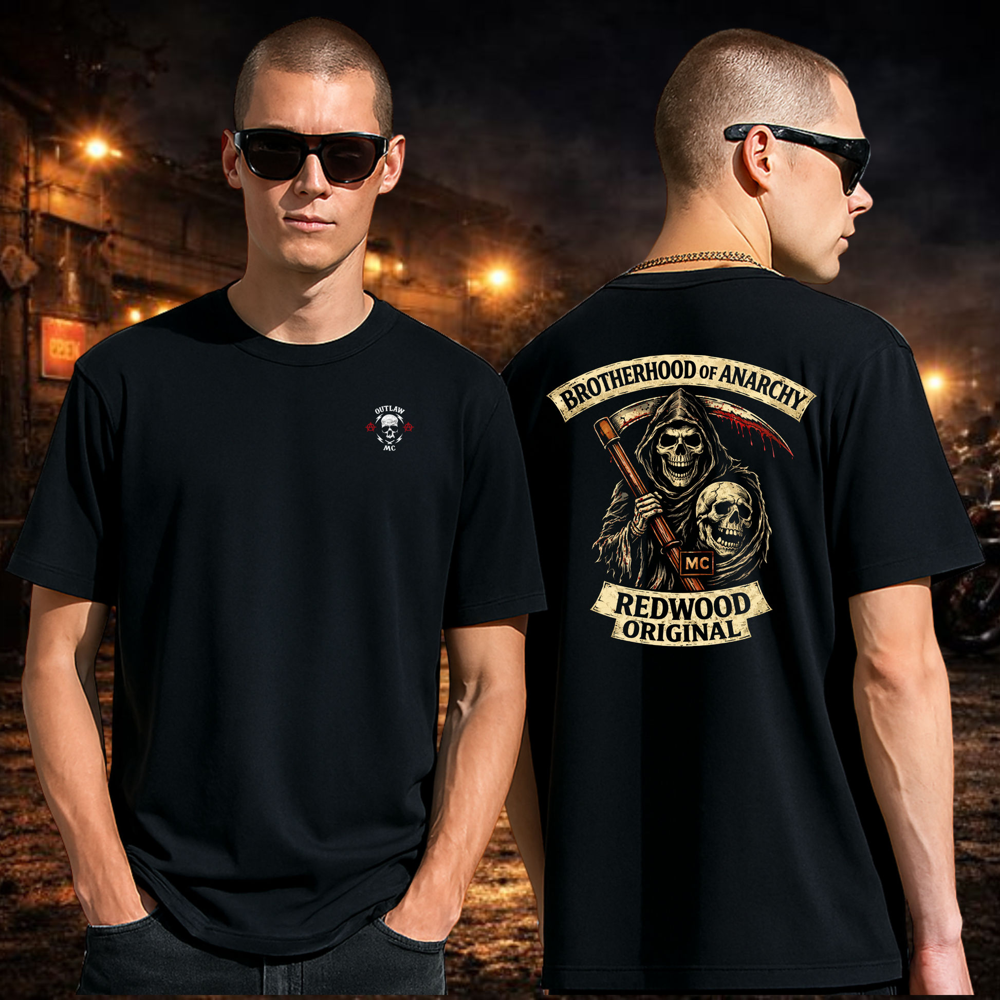 A grim reminder on the back — death, brotherhood, and outlaw legacy carved into one design.